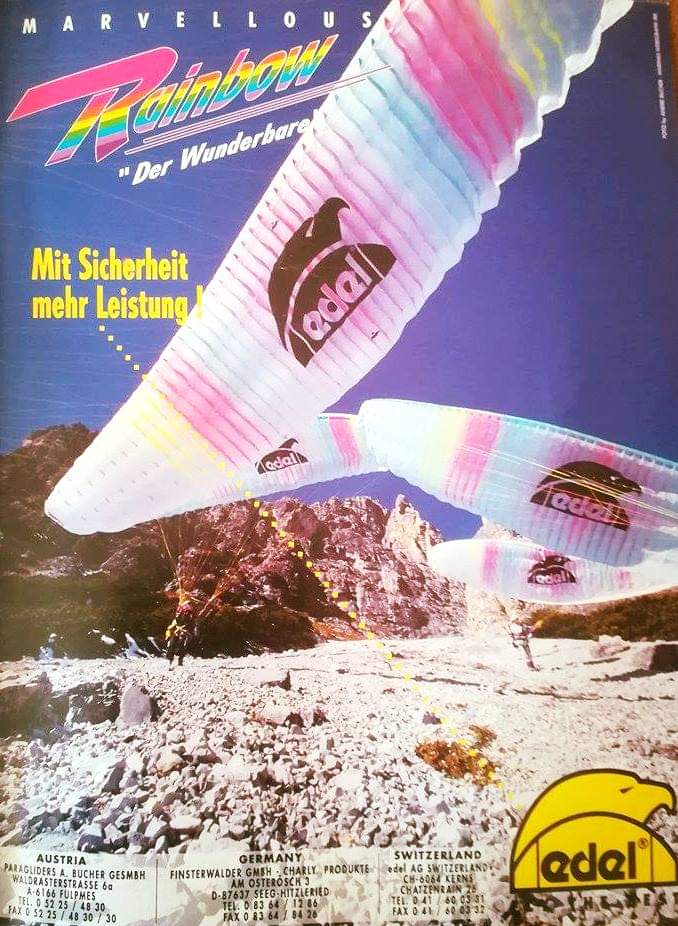En 1993, le parapente évolue très vite. Les marques sortent presque chaque année de nouveaux prototypes, bien supérieurs aux machines de série. La Rainbow n’y échappe pas. Edel a ses prototypes (les Racer II), qui marchent très fort… Et son aile de série, la Rainbow, qui ne peut pas rivaliser avec le haut du panier des ailes de courses.